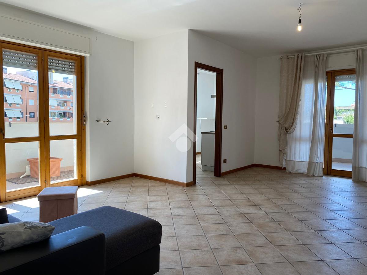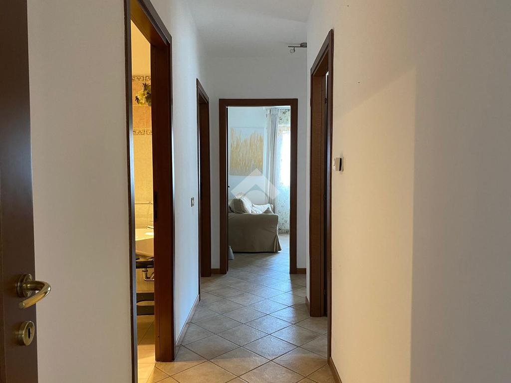 Internamente l’immobile è composto da ampio salone, cucina, tre camere da letto e due bagni, di cui uno con affaccio esterno orientato sud-ovest e uno cieco. Completano la proprietà un terrazzo e due balconi, di cui uno con accesso dalla zona notte.