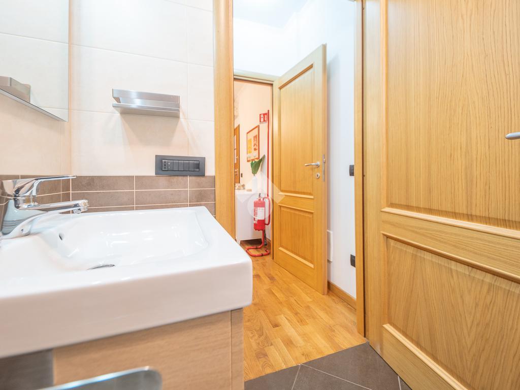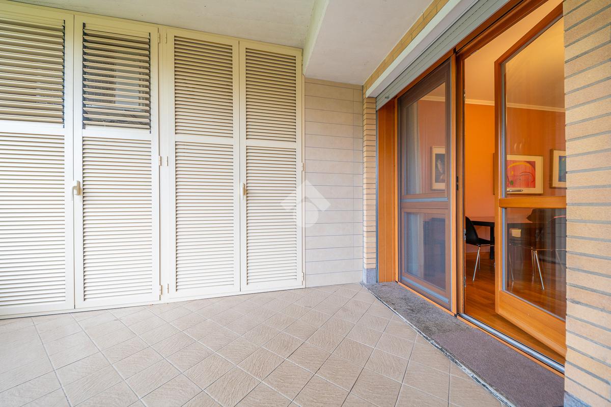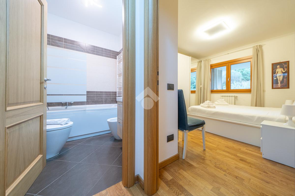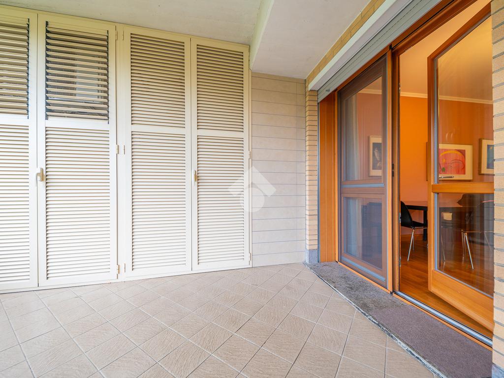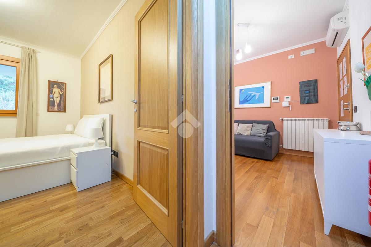 Il vero punto di forza della soluzione è il grande terrazzo con affaccio nel verde, un vero e proprio prolungamento della zona living: perfetto per cene all’aperto, momenti di relax e per chi desidera uno spazio esterno riservato e vivibile tutto l’anno