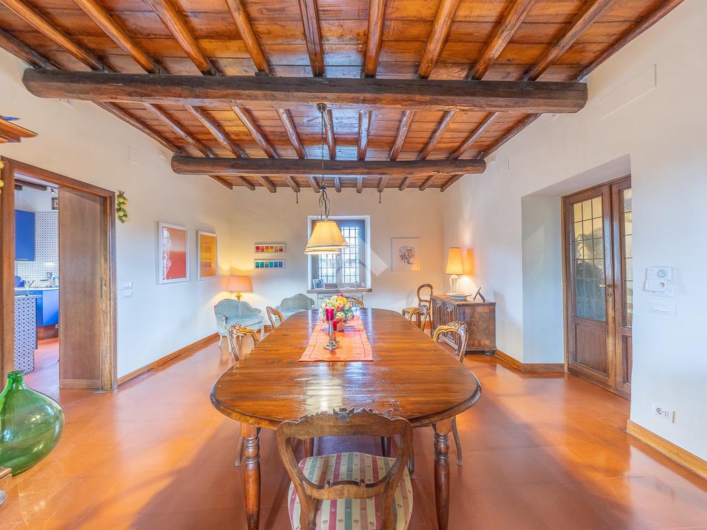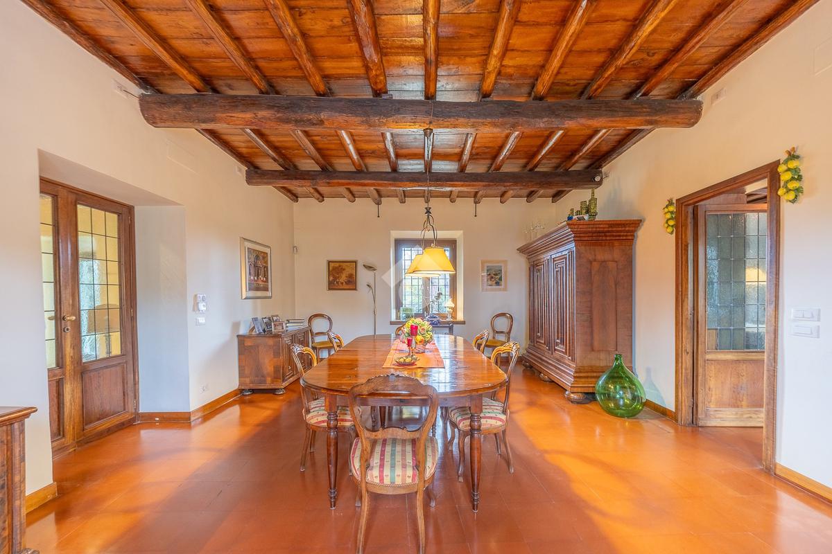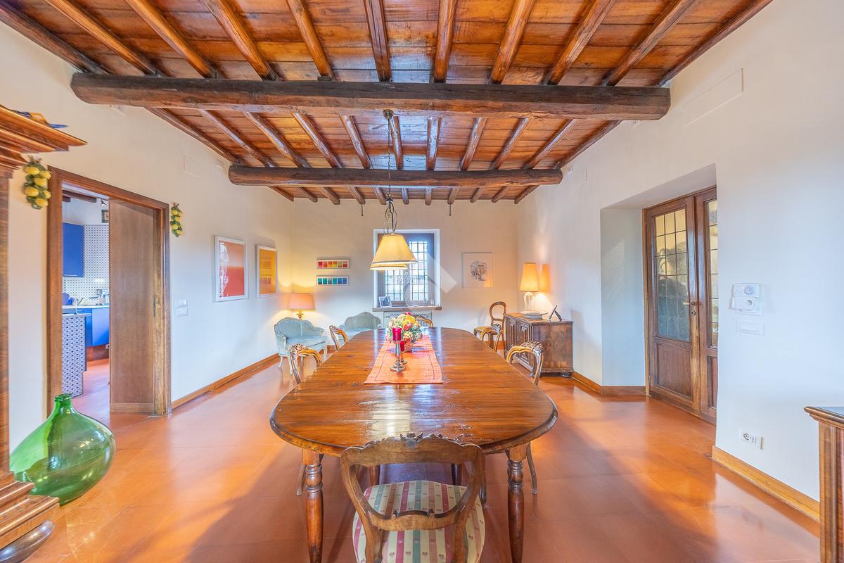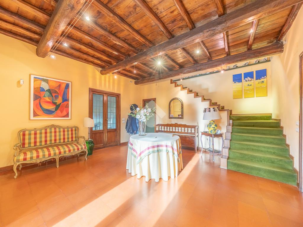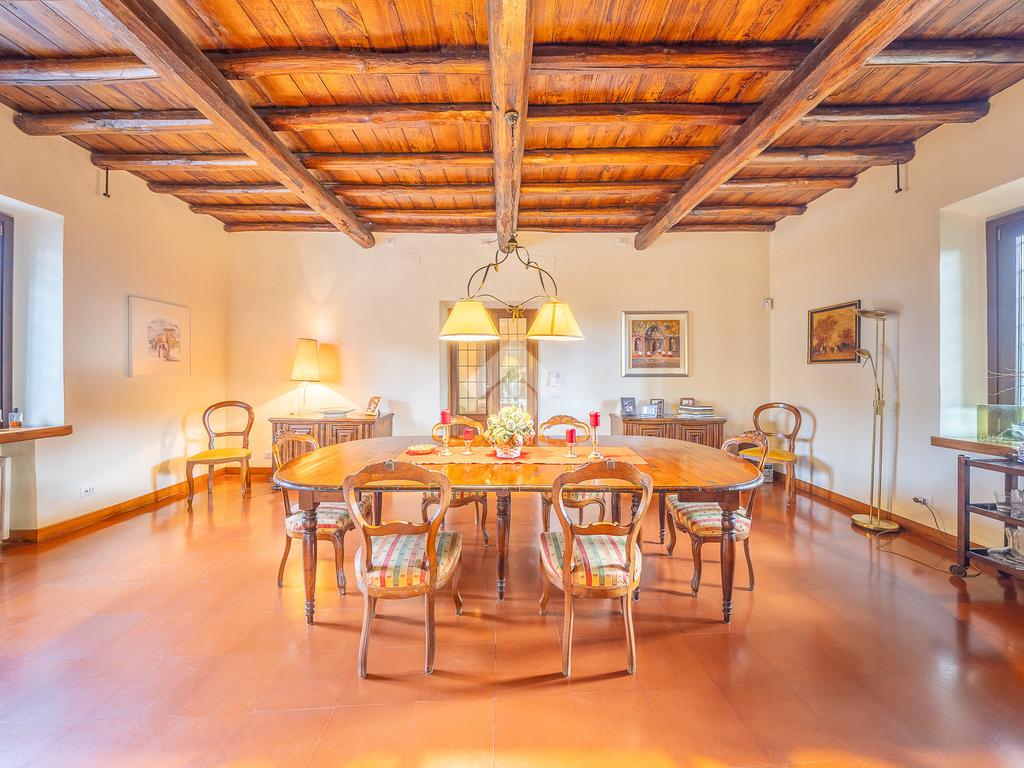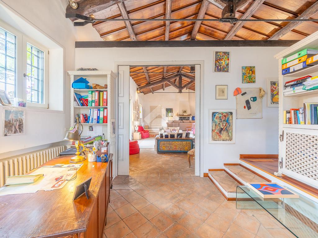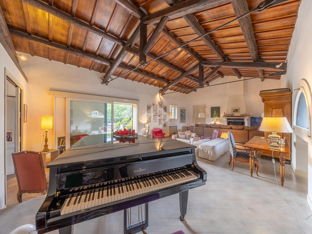 L’ampio ingresso introduce alla dimora con armadiature su misura e un bagno di cortesia. Da qui si apre un luminoso living doppio, valorizzato da grandi finestre ad arco, soffitti in legno con travi a vista e un importante camino. Adiacenti al living si trovano uno studio e un’area palestra. Un secondo studio con camino conduce a un bagno riservato e a un ripostiglio. Dall’ingresso si accede inoltre alla sala da pranzo, ideale per ricevimenti, e alla cucina professionale con camino e ingresso indipendente.